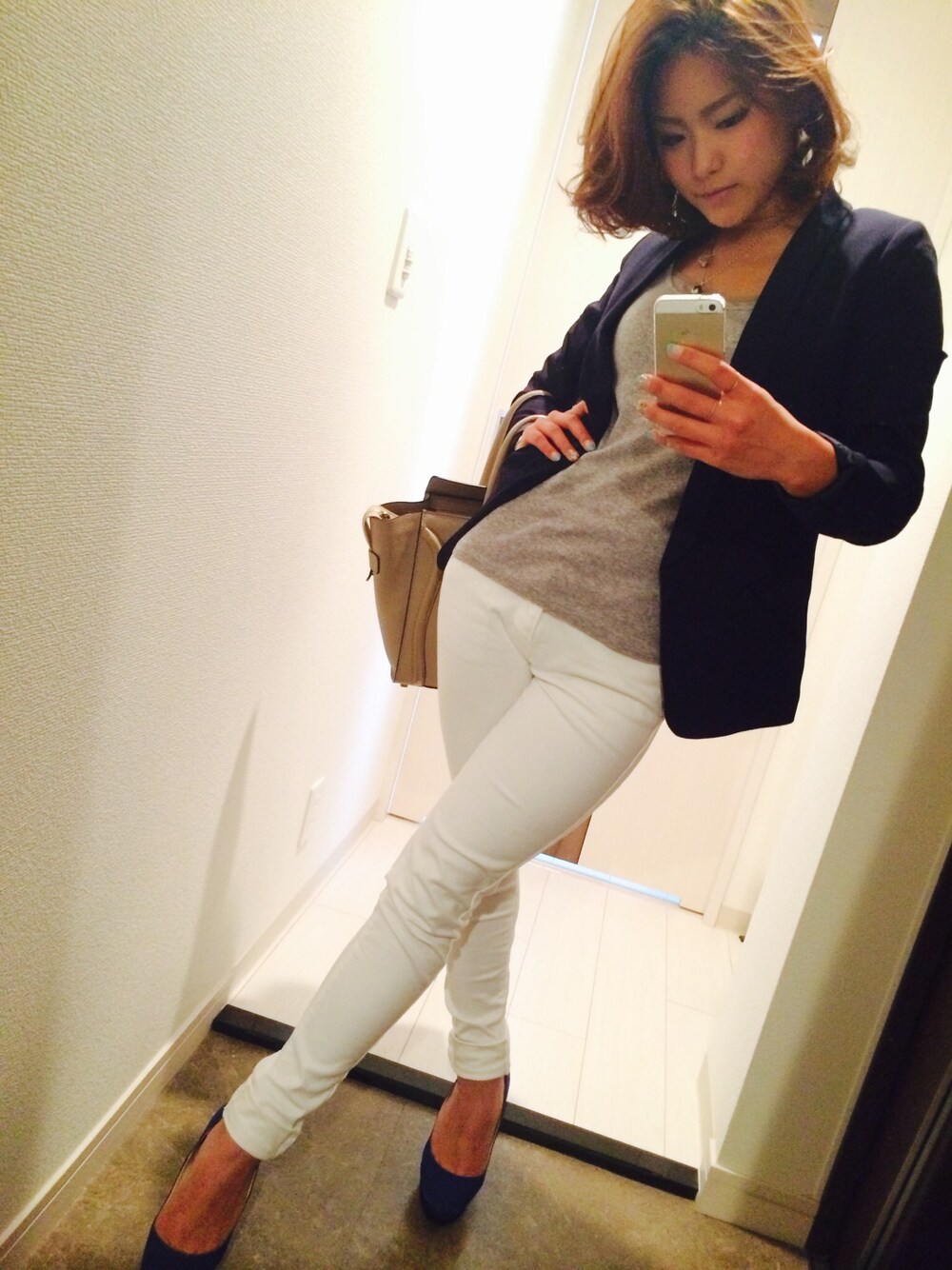 出勤コーデ。 H&MのネイビーJKを袖まくり。 グレーのタンクトップに アルマーニの白デニム。 エスペランサのネイビーパンプス。 やっと欲しかったリネンシャツ ゲトったので明日着まーすʕ•̫͡•ོʔ