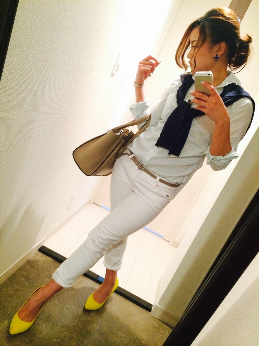 出勤コーデ。 グリーンのピンストライプシャツに アルマーニの白デニム。 トリコロールラインのカーデを プロデューサー巻きで イエローパンプス。 初夏的な⁽˙³˙⁾ 爽やかコーデ的な⁽˙³˙⁾