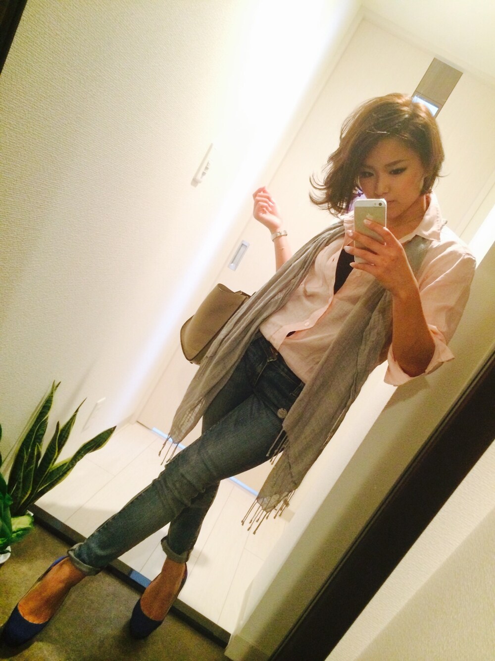 出勤コーデ。 淡いピンクのリネンシャツは ジャーナルスタンダードで 購入したメンズのSサイズ❤︎ デニム&サプライのデニムに ストール、ネイビーパンプスの ハンサムコーデでございますʕ•̫͡•ོʔ
