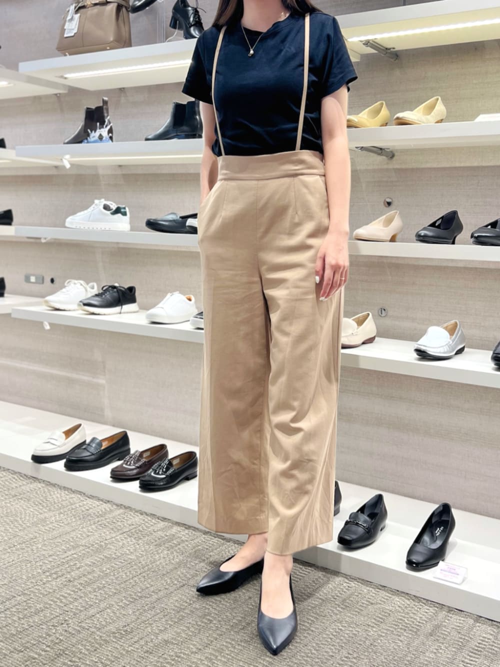 大人っぽい雰囲気を意識したシンプルなコーデ。 ブラックカラーにポインテッドトウのデザインはカッコよく上品な印象にしてくれます。 踵のおさまりが良く、抜ける感じはないので、履き心地は抜群◎ 個人的に履き口の浅い靴は素足で履くのが好きなので、いつもの24cmでピッタリでした。