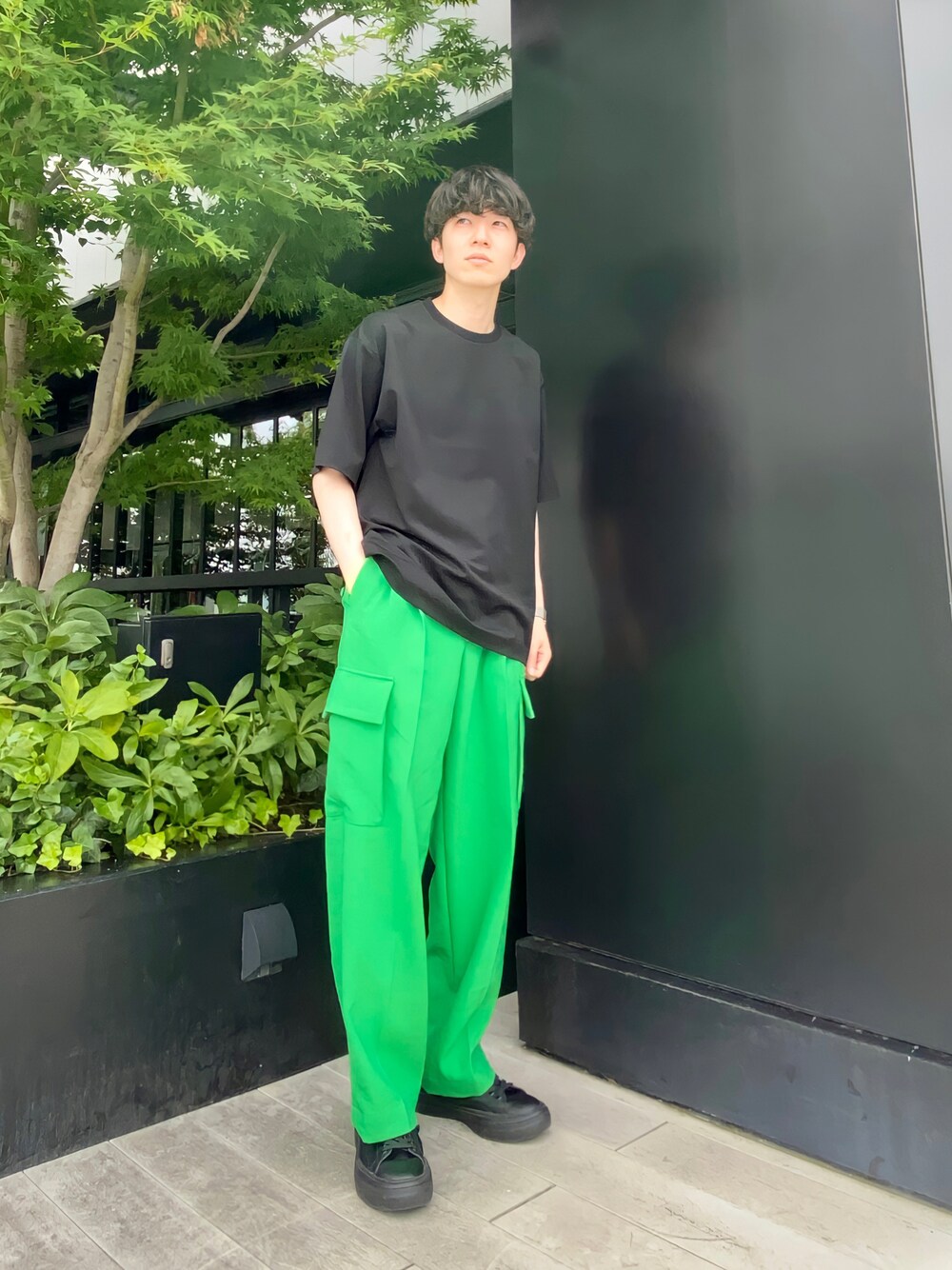 無彩色を合わせて、発色の良いグリーンを主役に。 トレンドのカーゴパンツで今っぽく。