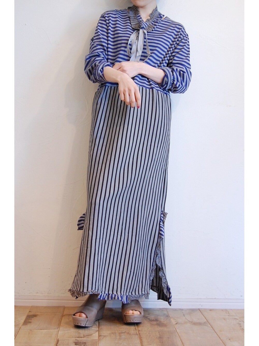 chaosbohemiaのワンピース「フリルロシアボーダーワンピース」を使ったコーディネート