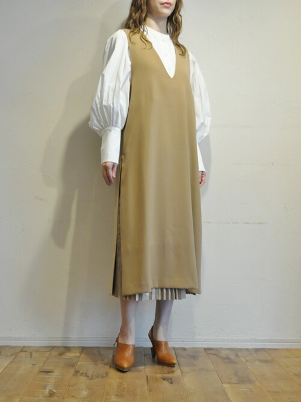 ANGELINAで好評のリラックスシリーズ。 深めにスリットが入った、マニッシュな印象のワンピース。 インナーにはタフタ生地のスッキリとしたプリーツスカートがセットになっています。 スリットからプリーツがチラ見えするデザインです。 インナーを外すとロングベスト風にも使えます。 普段にも仕事着にも便利なアイテムです。 全2色展開。 ●商品一覧トップページはこちら↓ http://urx3.nu/LHHy