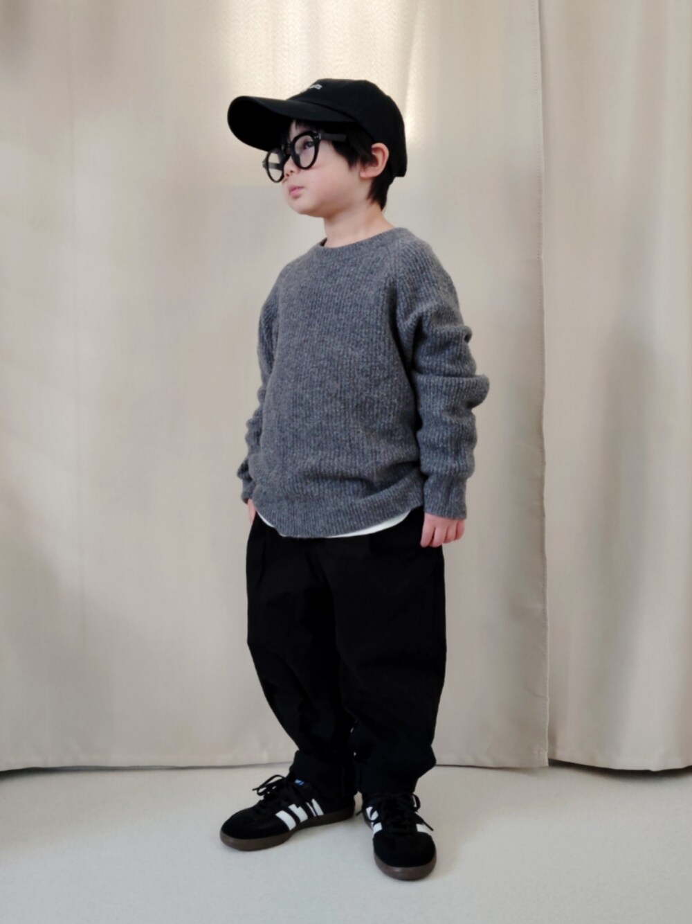 《REI》4y9m/108,4cm/18,7kg クラウンパントサングラス/《UNIQLO》 商品番号:466264 color:09BLACK size:男女兼用 ONE SIZE スフレヤーンセーター/《UNIQLO》 商品番号:473312 color:07 GRAY size:130 タックワイドパンツ/チノ/《UNIQLO》 商品番号:472843 color:09 BLACK size:120