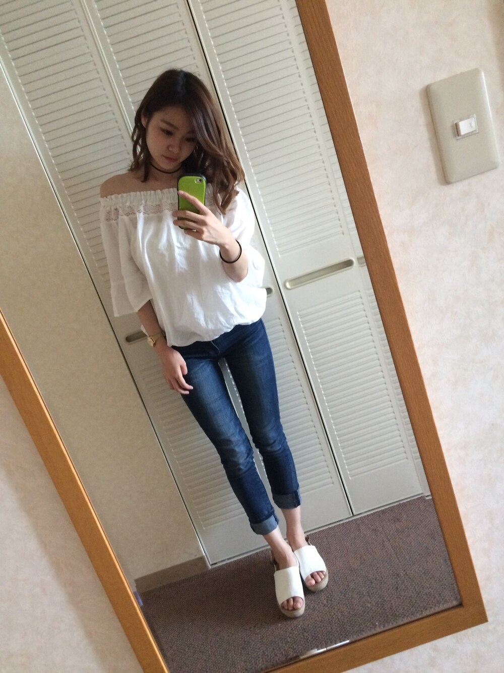 オフショルにジーンズで簡単コーデ! オフショルはノーブランド!