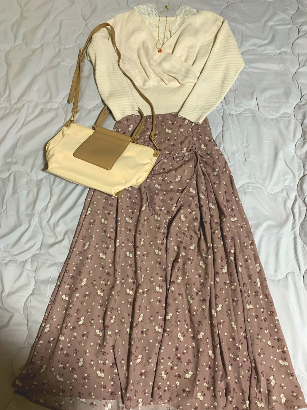 3月8日(金) 2年程前に購入したhoneysのくすみピンクのスカートにGRLのニットを合わせました🌸