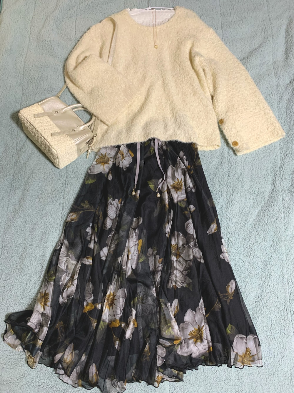 3月17日(日) ふわふわ軽いシフォンスカートに白いニットを合わせました🤍🖤
