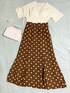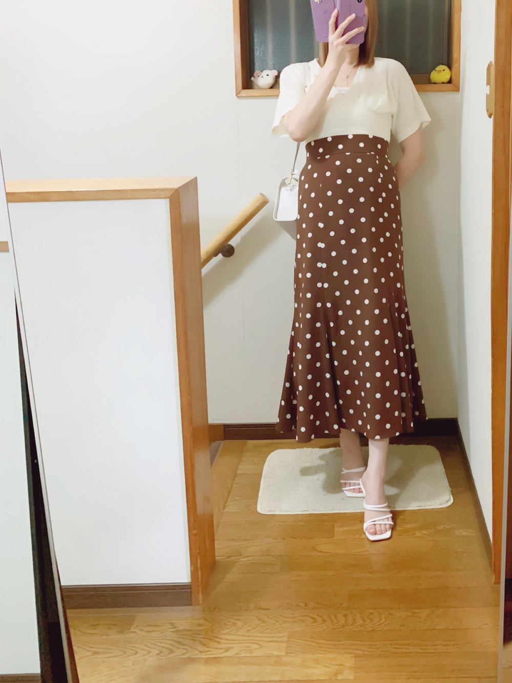7月13日(土) ☀️ SHEIN購入の柔らかい肌触りの通気性の良い生地のトップスにドットスカートを合わせました•*¨*•.¸¸♬︎ ハイウエストのスカートはスタイルアップ効果があるので好きです𓂃𓈒𓏸︎︎︎💕 ホワイト×ブラウンコーデです