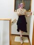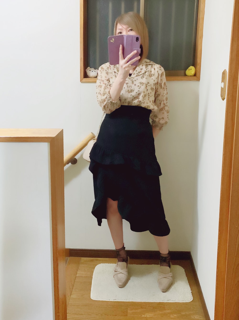 10月2日(水)☀️ 予想最高気温30℃ 見ていただきありがとうございます😊 本日は花柄のブラウスを使ったコーデです🌸 ベージュ地に花柄が散りばめられたブラウスは、去年メルカリで購入しました- ̗̀ 😆 ̖́-👍 開襟に袖口、ウエスト部分がシャーリングになってます❣️ 七分袖になります😊 お気に入りのスカート(3回目)に、足元はレースソックス、ミュールを合わせてみました✋