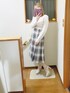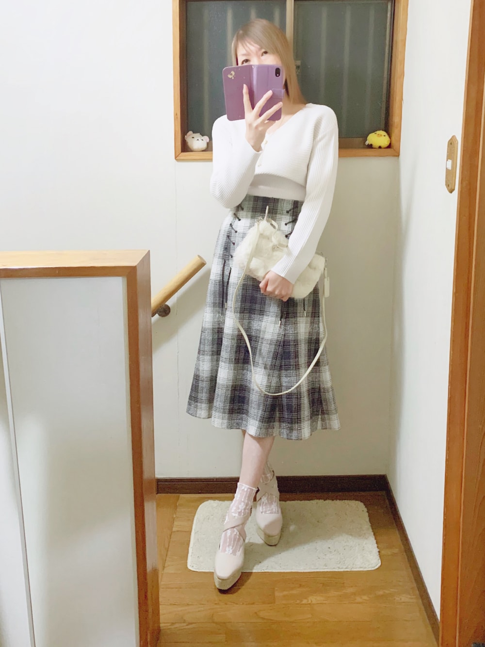 12月4日(水)☀️ 予想最高気温15℃ 見ていただきありがとうございます😊 本日はチェックのスカートを使ったコーデです✋ 両サイドにループの付いたデザインで可愛いです😆💘歩くと先がユラユラ揺れてます🎶 フレアスカートになります トップスには、GUのキャミと胸元がひねられた短丈ニットのセットを着てみました😊✨ 発売してわりとすぐに買ったのですが、今はお値下げされていましたよ👍 先日、京都に行った時に同じ色を着てる人が居て、すぐに同じニットだ‼️ってなりました ꉂꉂ🤭 その日、着て行かなくて良かった🧶 すれ違う時、同じだと嫌ですよね、、😅