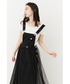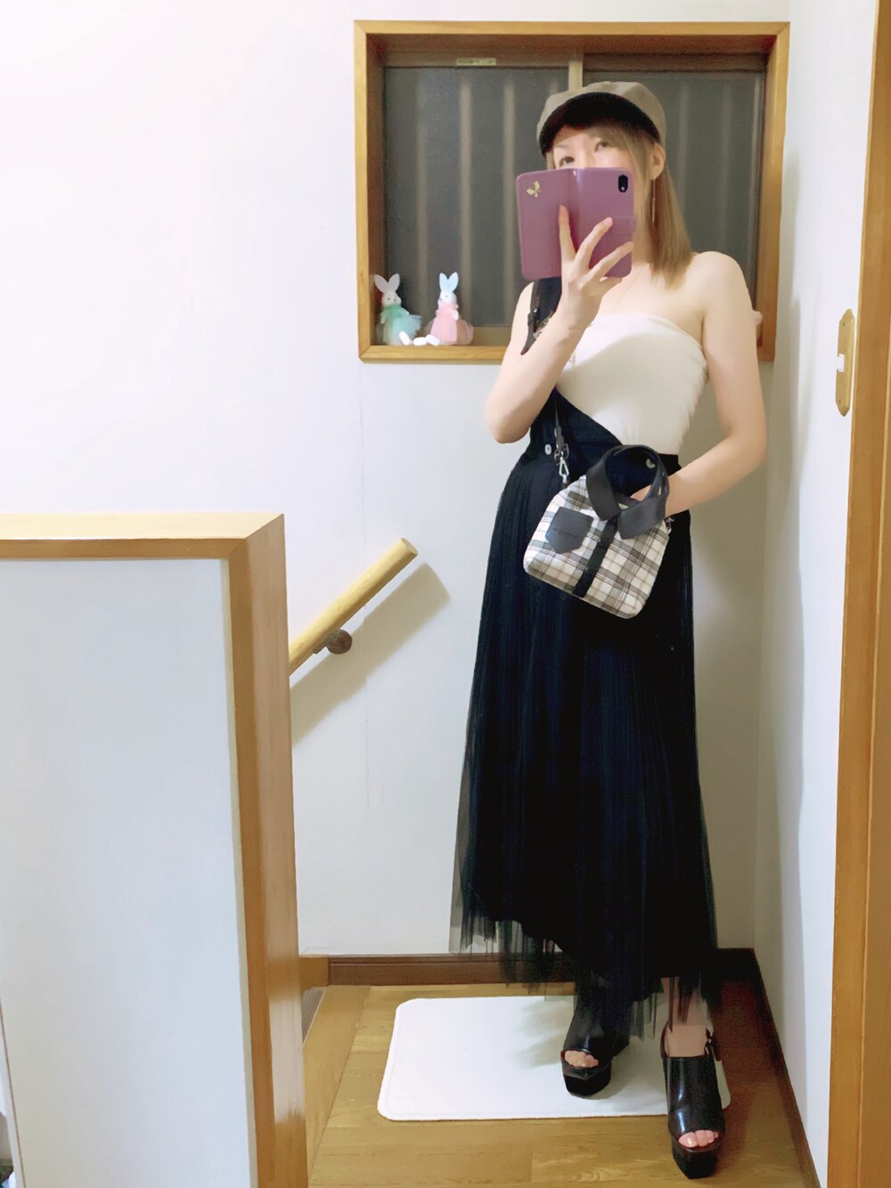 7月18日(金)🌤️予想最高気温31℃ 見ていただきありがとうございます😊 本日はチュールデザインのサロペットスカートを使ったコーデにしてみました❣️ サロペット×チュールのとっても素敵なスカートです🥰 チュールはプリーツになっています❣️ 今回は肩紐を片方下げてみました😊 インナーには、チューブトップを着ました 胸元はゴムがしっかりしているので下がりません とってもユニークなバッグ型バッグを合わせました👜 サンダルは厚底で、、👡 重いです、、💦