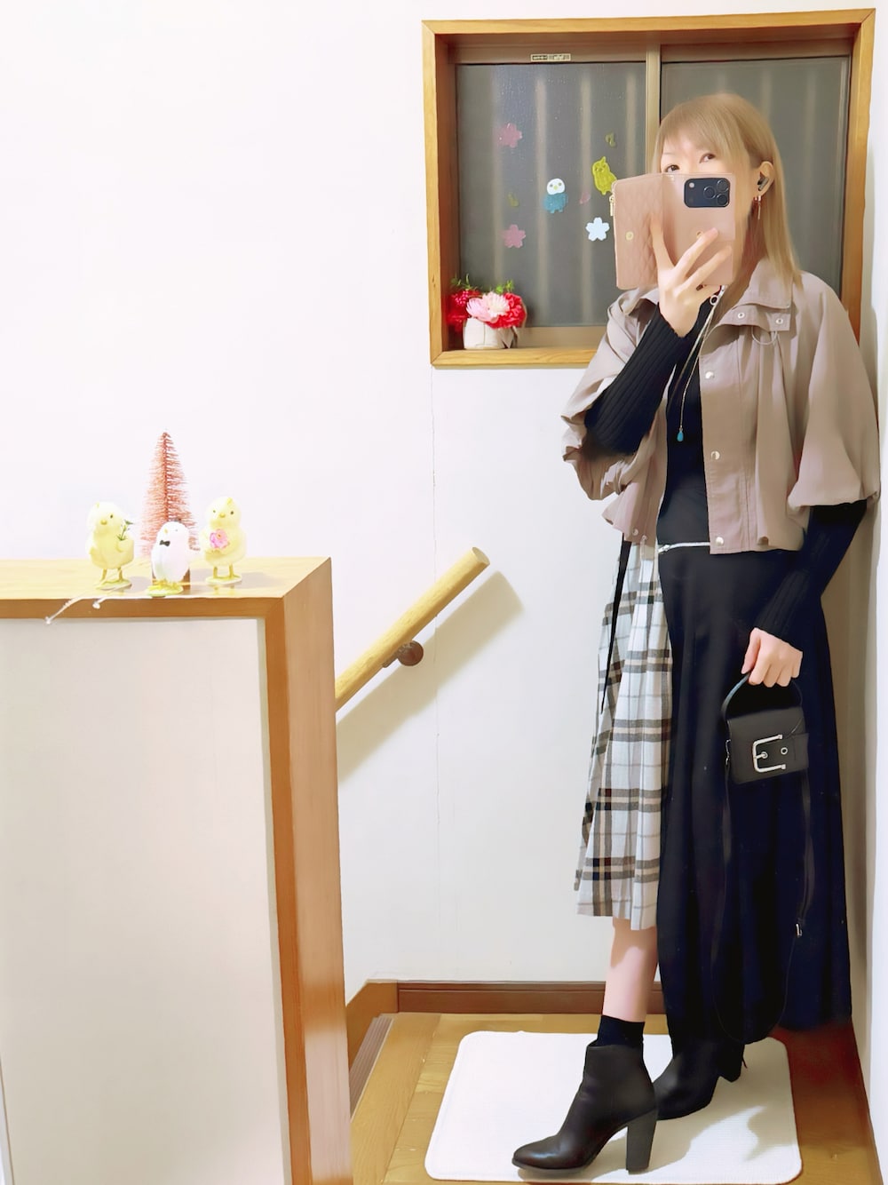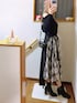 3月16日(月)☀️予想最高気温16℃ 見ていただきありがとうございます😊 本日はレイヤードスカートが穿きたくて組んでみたコーデです🎵 淡いグレー生地の黒のチェック柄のスカートに、 ZIPの付いた腰巻きスカートを巻きますꔛ このスカートセット、重くて2キロくらいありそう🫢‼️腰巻きが重いです💦 しっかり巻かないとずり下がってきます(笑)🤭 インナーに、オープンショルダーのリブニットを❣️ 細身で、斜めのジッパーデザインがお好み😍♥️ ブラウンのブルゾンは、5分袖のバルーンデザイン🎈 裾もバルーンになっています🎈⸒⸒