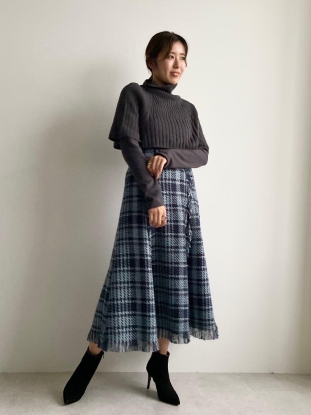 ・身長159cm 普段サイズ スカート36/シューズ24.5cm 【サイズ感】 スカート:やや小さめ シューズ:標準的 【素材感】 スカート:ツイード素材で厚みのある生地 ダークグレーカラーのニットを合わせて甘さを抑えたコーディネートです。