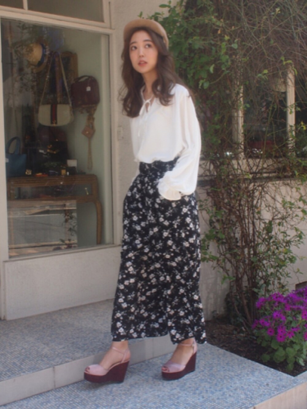 軽い素材感のブラウスにワイドパンツで、モノトーンコーデにもリラックス感を🌷