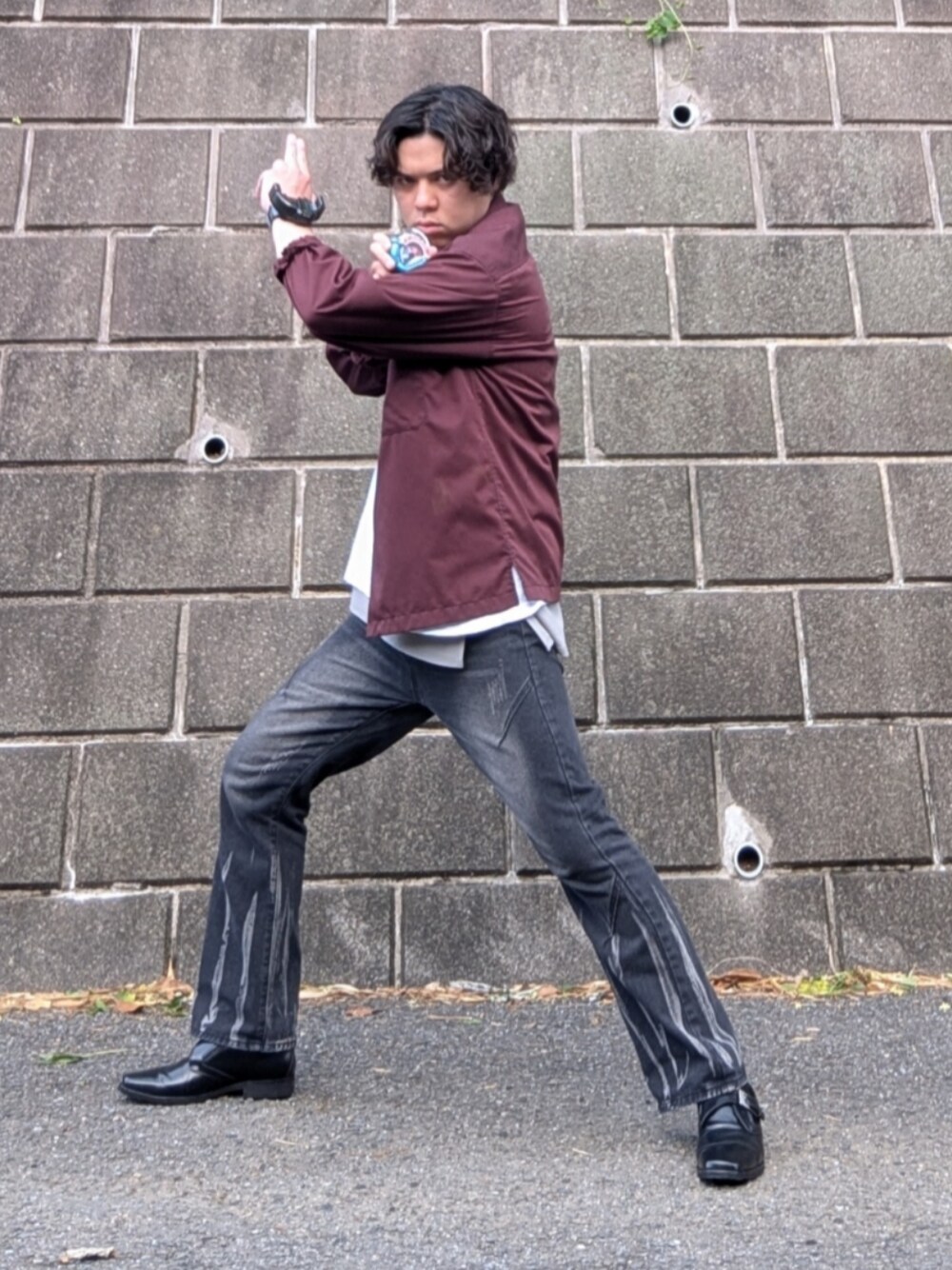 トップスのホワイトと レイヤードのグレーで アンダースーツ。 ワインレッドのシャツアウターで メットパーツやゴーグル フレアデニムと モンクストラップシューズで 範道(はんどう)「大也(たいや)」。 「タイヤ」といえば黒いので