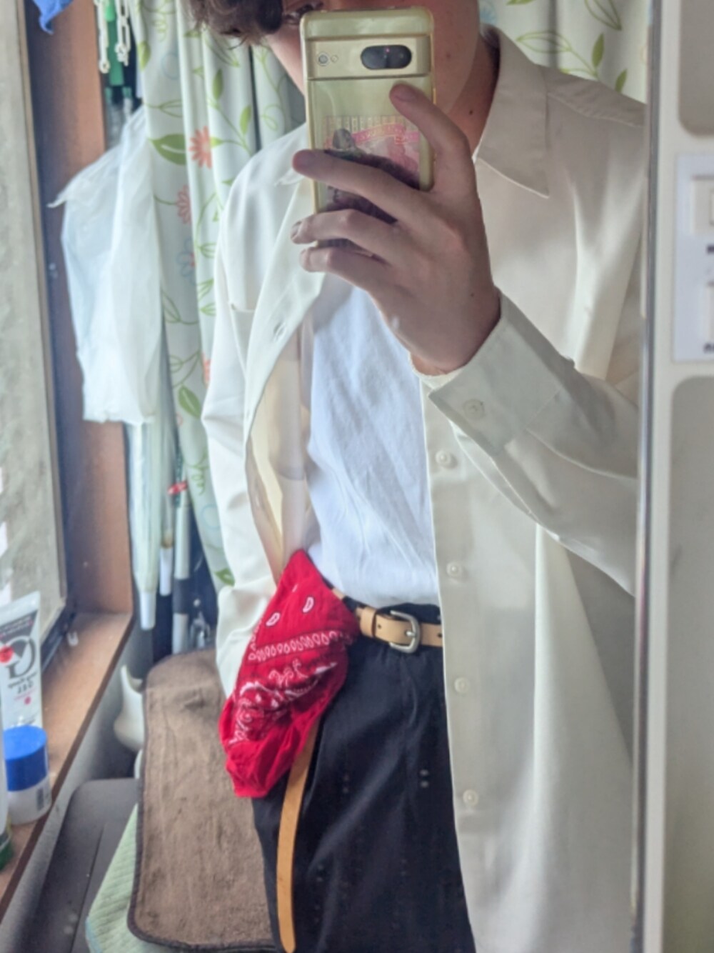 仮面ライダーガヴ ケーキングフォーム概念。 カーゴパンツで メットパーツや随所の黒。 ベージュのナローベルトで 随所の金色。 バンダナとトップス、 シャツアウターで 全体のショートケーキ要素。