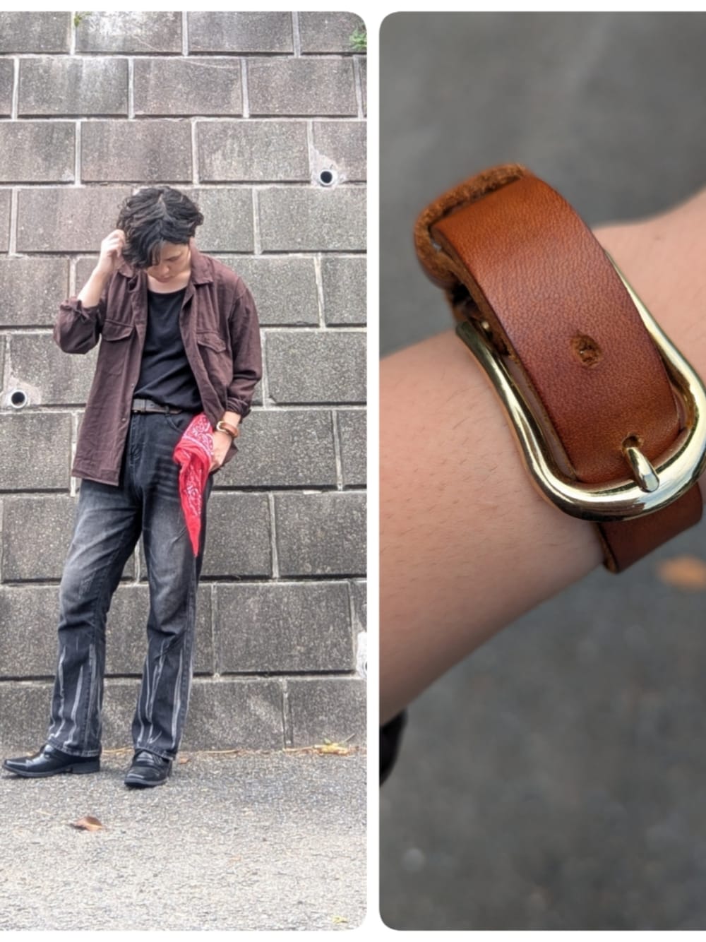 仮面ライダーグリス概念。 ブレスレットのゴールドで アンダースーツ。 バンダナで複眼。 ブラックフレアデニムと タンクトップで随所の黒や モチーフの潤滑油。 ブラウンのベルト、 ブレスレット、 シャツアウターで 「猿」渡(さわたり)一海(かずみ)基私服概念。 「猿」といえば茶色なので