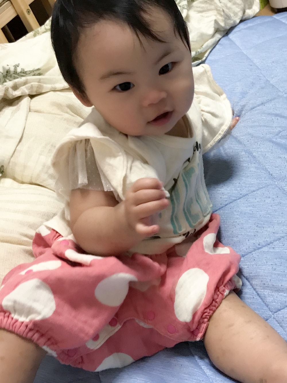 今日は楽チンロンパース( ¨̮ ) 80cmを着せるようになってから ロンパースはこれ1着しか買ってないんだけど とってもお気に入り( ¨̮ ) お尻ぷっくりのかぼちゃパンツ風で赤ちゃんっぽいのもたまには良いかな( ¨̮ ) まだまだ赤ちゃんだし( ¨̮ )