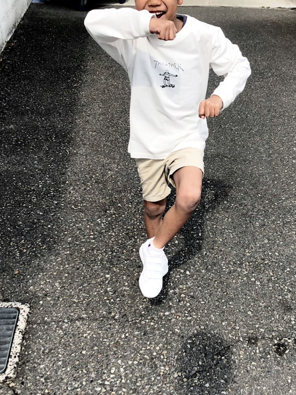 ・ ・ むすコーデ☺️(6歳児) おちょけなポージングしてくれました😂 ・ ロンTにベージュの短パンと シンプルコーデ🛹 ・ 手書き風THRASHERロゴが可愛くてお気に入りです🥰 ・ ・