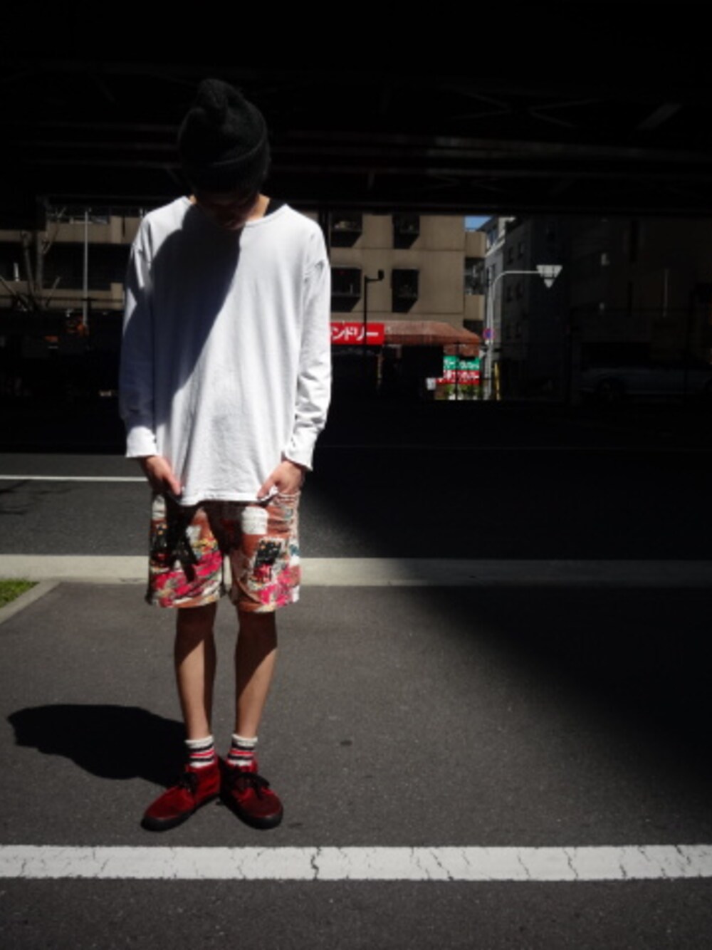 ホワイト系のTシャツ/カットソー、ブラウン系のその他パンツ、レッド系のスニーカーを着用したメンズの春コーディネートの1枚目の写真