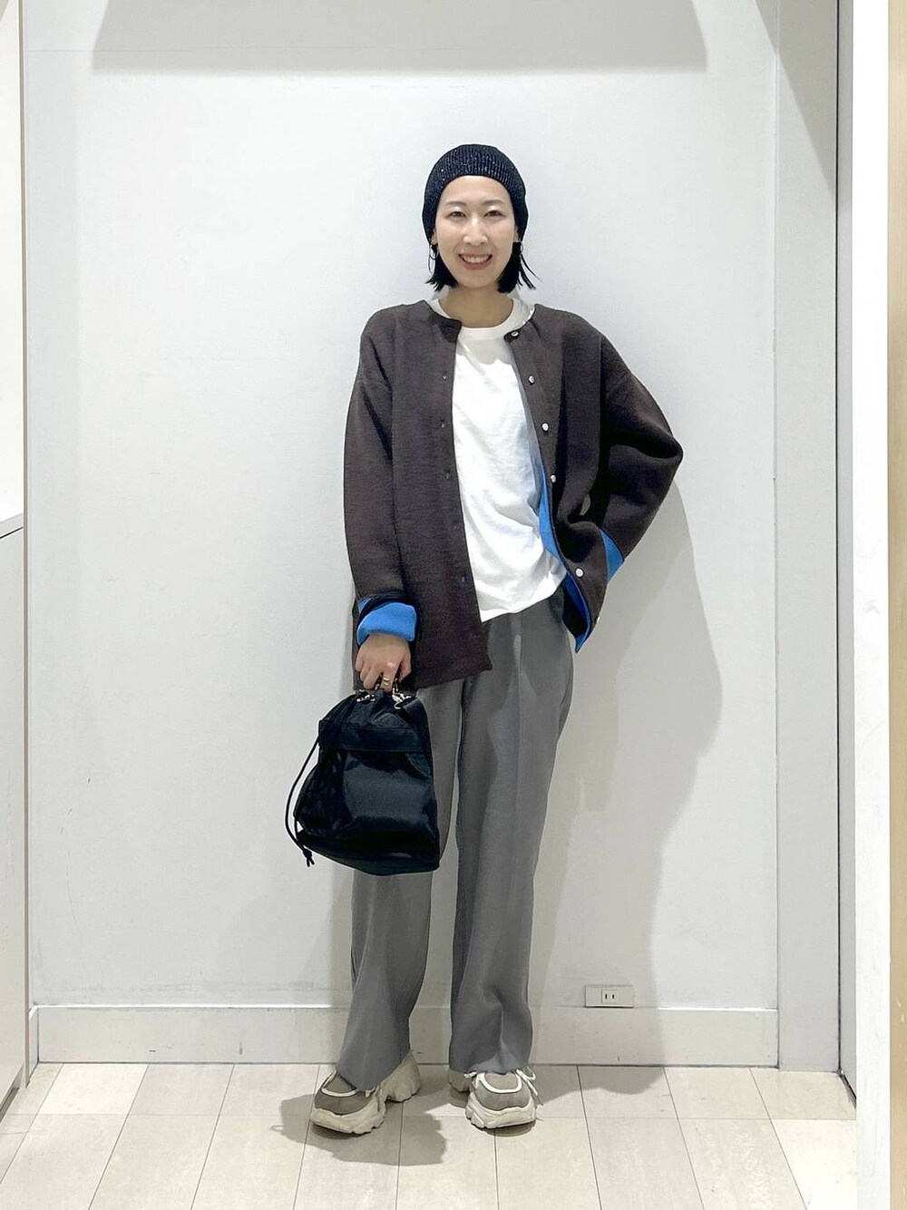 カジュアルスタイル 今年流行りのバイカラーニット 生地感もしっかりしてて ちょっとした羽織にも使ってもらえる大きさです 他のニットよりかは少し大きめになっているイメージ ポケットも付いてます 中のブルーの色味がとってもかわいいです 袖を折り返すとブルー出ますが シンプルにいきたいときは折り返しなしでも使えます お値段も履き心地もちょうどいいイージーパンツ ウエストにボタンが付いていたり センタープレス加工がされているので ちょっときれいめに履けます ウエストゴムで脱ぎ着も楽ちんです 今回はカジュアルに合わせたくて 小物はカジュアルに ニット帽持ってきてます