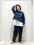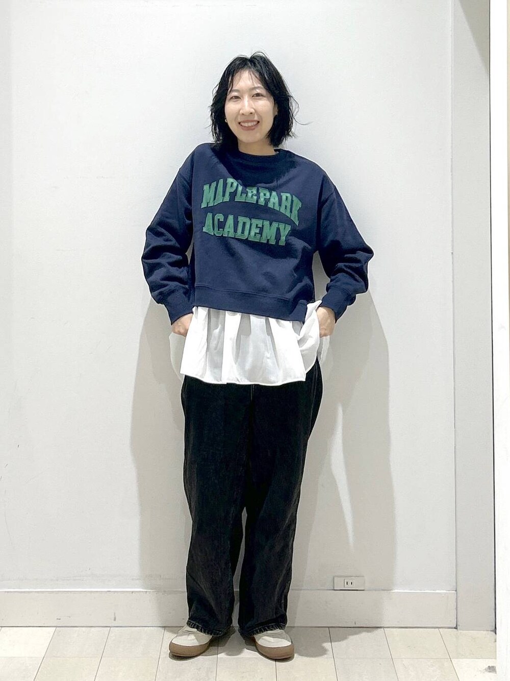 カジュアルコーデ 重ね着でかわいいカジュアルコーデです ロゴのスウェットは カジュアルコーデの大定番 ショート丈でインナーと組み合わせると 体型隠しにもばっちりです 楽ちんデニムバギーパンツ ウエストゴムでウエスト本当に楽です ブラックデニムは 秋冬のお洋服とも合わせやすい色味です