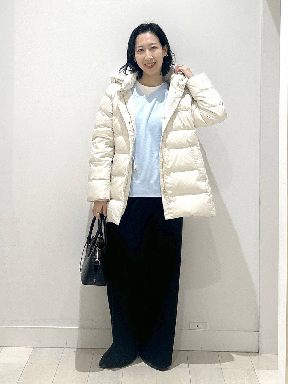 通勤スタイルにもおすすめ きれいめカジュアルコーデ 寒くなってきたときに 一つあると嬉しいダウンコート お尻が隠れる長さがあるので 防寒対策にもおすすめです 袖口がリブになっていて風が入りにくくなっています リブ部分はダウンの袖で隠れるので カジュアル感もなく着てもらえます フードは取り外し可能 中がファーになっているのでかわいいです 中のドローコードを締めてもらうと くびれができてスタイルアップと パンツスタイルにもおすすめです ふわふわした生地のあったかニット 首元Vネックですが 深さがないので骨格ウェーブでも着やすいです 今回は中にインナー着てるので 合わせてみるのもおすすめ インナーなしだとよりきれいめに着用できます ウエストゴムのあったかパンツ 裏起毛で履く時のひんやりもありません ほどよいワイド感なので ゆるめスタイル好きな方におすすめです