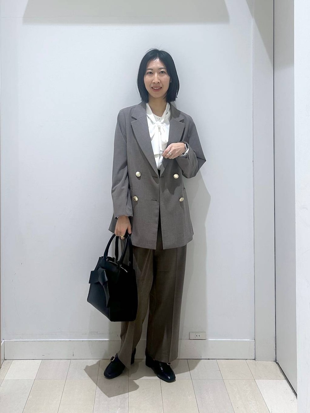 オケージョンにもお仕事にも おすすめスタイリング ジャケットはダブルボタンですが 比較的ゆとりのある作りになっているで かっちりしすぎないスタイルで着れます パンツもウツクシルエットで 足が綺麗に見えます 前ホックズボンですが 後ろがゴム仕様になっているので 楽ちんにはいてもらえます オケージョンスタイルする場合は ブラウスを襟のみのシャツではないのを 選ぶと華やかさがでます 袖口ゴム仕様など 動きやすさもあるのでおすすめです
