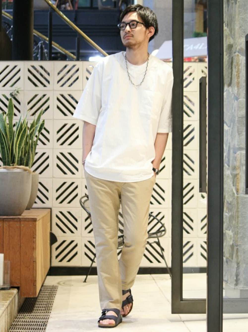 Tシャツ型のリネンプルオーバーシャツに、アンクル丈のリネンパンツを合わせたリネンスタイル。足元はビルケンのサンダルで抜け感を出しました。