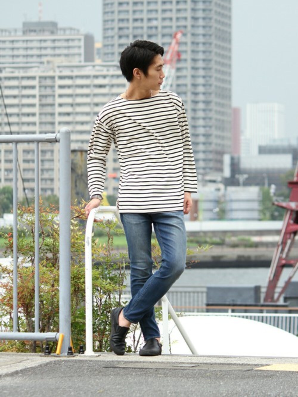 ゆったりとした今季らしいサイズ感のボーダーカットソーは、シルエットにメリハリをつけるためにスキニーデニムとスタイリング。
