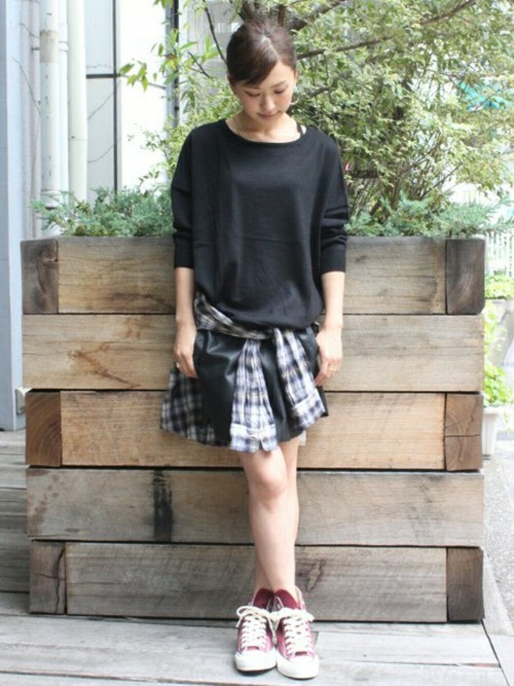 秋の新作でまとめてコーディネート! バイカラーのワイドプルオーバーにレザーのスカートを合わせて。 ウエストにはチェックのシャツを巻いて、少しグランジ風なスタイリングに。 足元に色を足せば、アクセントに。