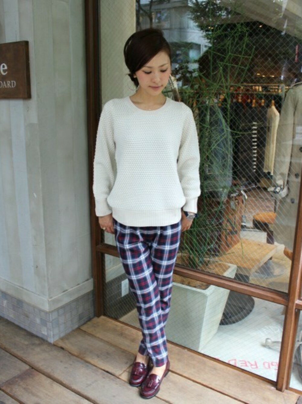 今シーズンマストのチェック柄をレギパンで取り入れたリラックスコーデ。 トップスにはもこもことした風合いがかわいい、タック編みのプルオーバーで優しい雰囲気に仕上げました。