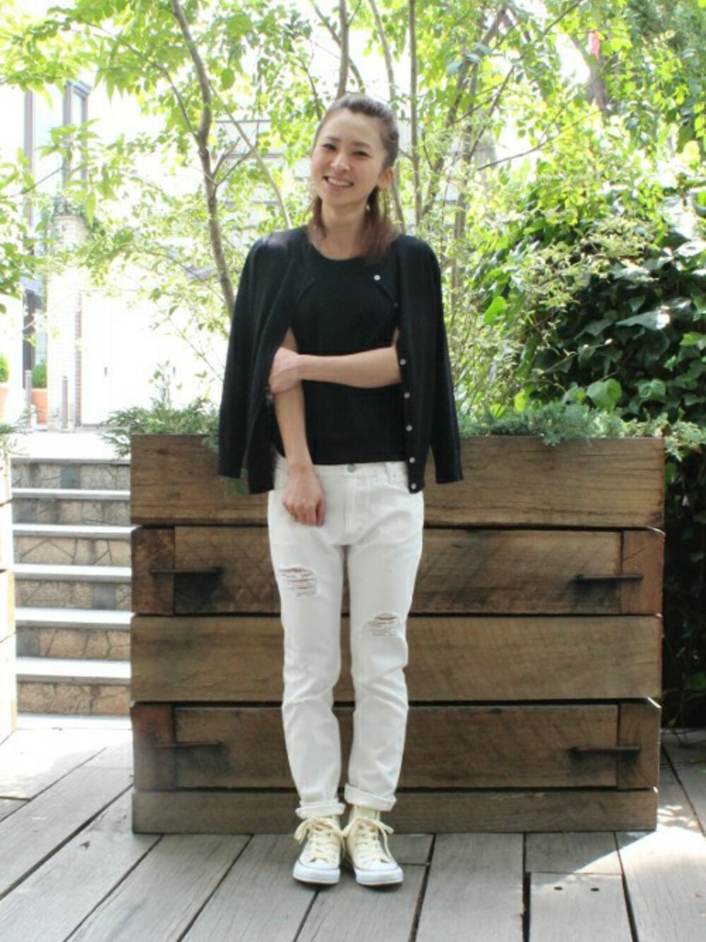 ホワイト×ブラックのモノトーンコーデ。 ツインニットのカーデを肩からさらりと羽織ってきれいめカジュアルに。