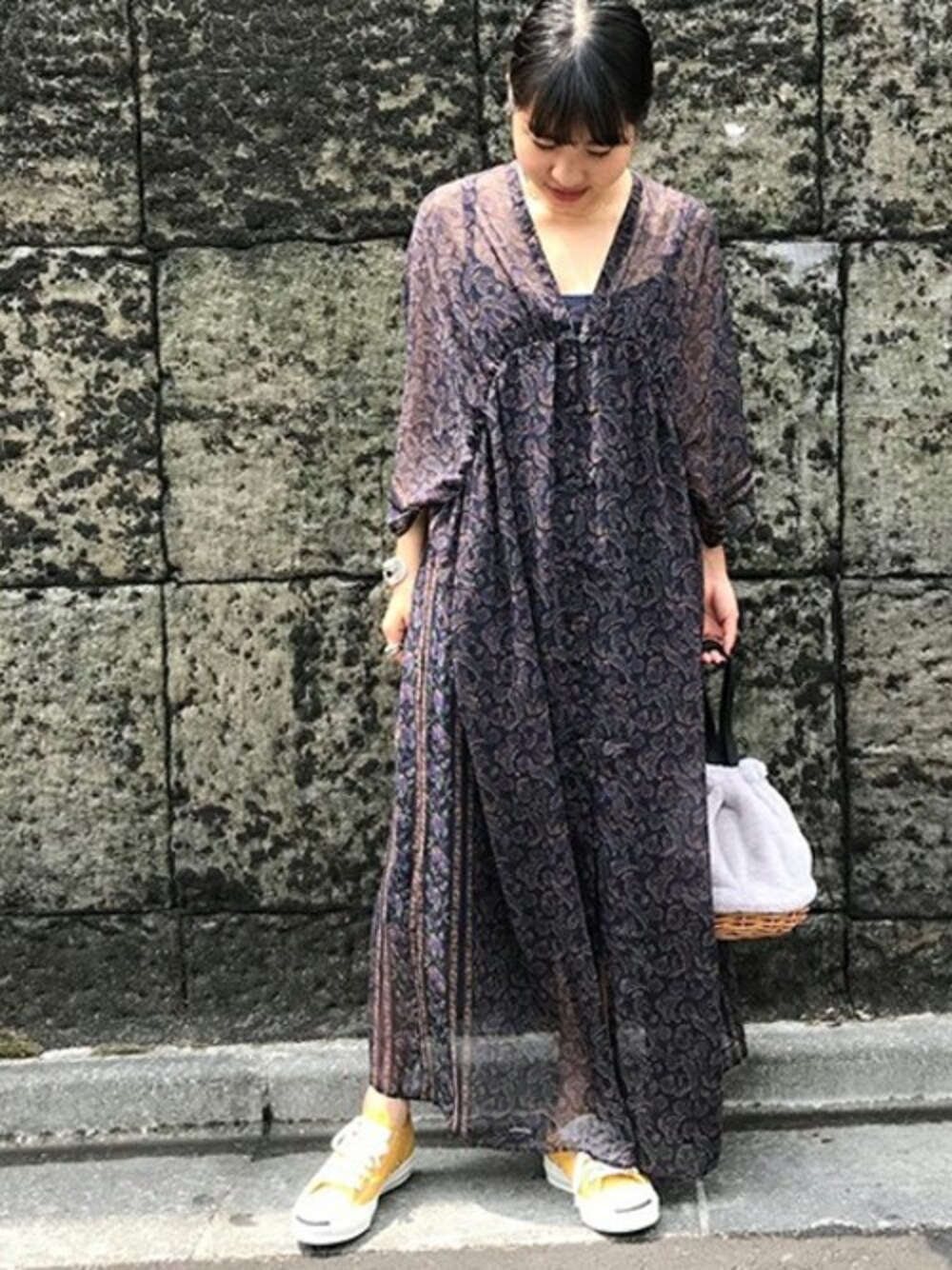 秋のペイズリーワンピ 透け感のある薄手の秋ワンピは今の時期も一枚で着られる優れもの。 パンツをレイヤードしても◎