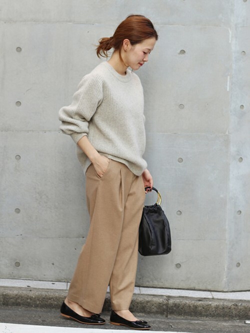 グレーのニットにベージュのパンツを合わせたトーンオントーンコーデ。 ブラックの小物でアクセントをプラス。