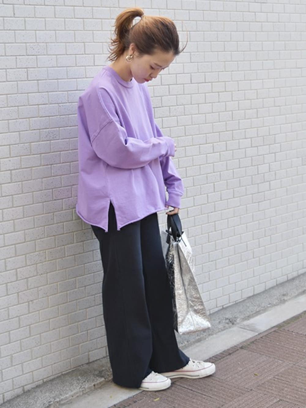 パープルと一緒に! 今シーズンはパープルを取り入れたコーデに注目。 普段色物はあんまりという方にもおすすめなドライタッチな風合いのカットソーに リブパンツを合わせてすっきりまとめました。