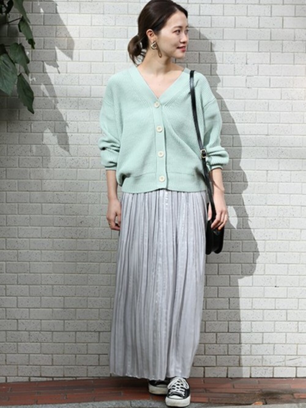 注目春ニットスタイル 程よく厚みがあり、今時期から着易いバルキーニット! 光沢感のあるシャイニープリーツスカートを合わせて透明感ある着こなしに。