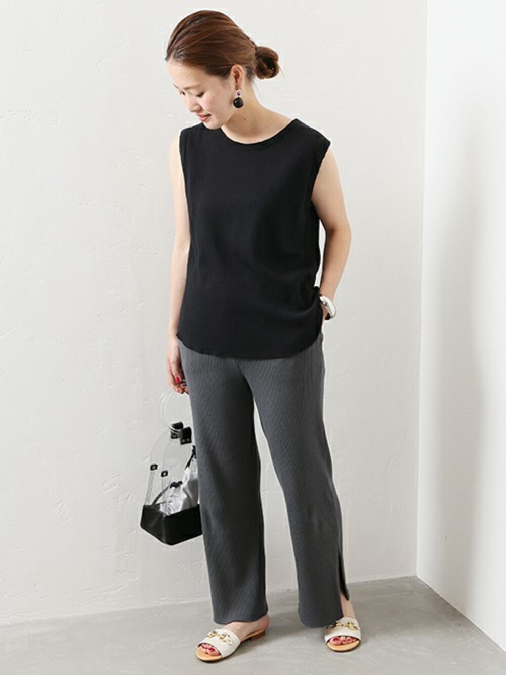 大人リラックス 落ち着いたグレーのリブスリットパンツが新登場。 モノトーンでまとめて大人なリラックススタイルに。