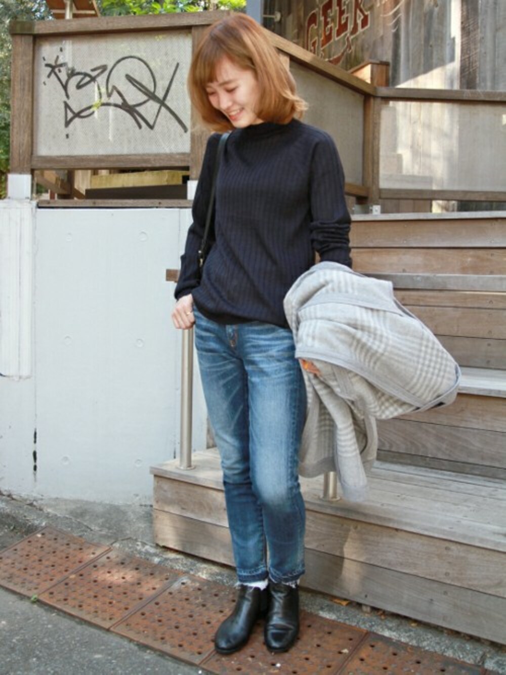 今年人気のワイドリブハイネックニット。 シックなネイビーもシンプルにデニムと合わせカジュアルダウン。 ダブルフェイスのチェスターコートは、脱いだ時のチェック柄がポイントに♪