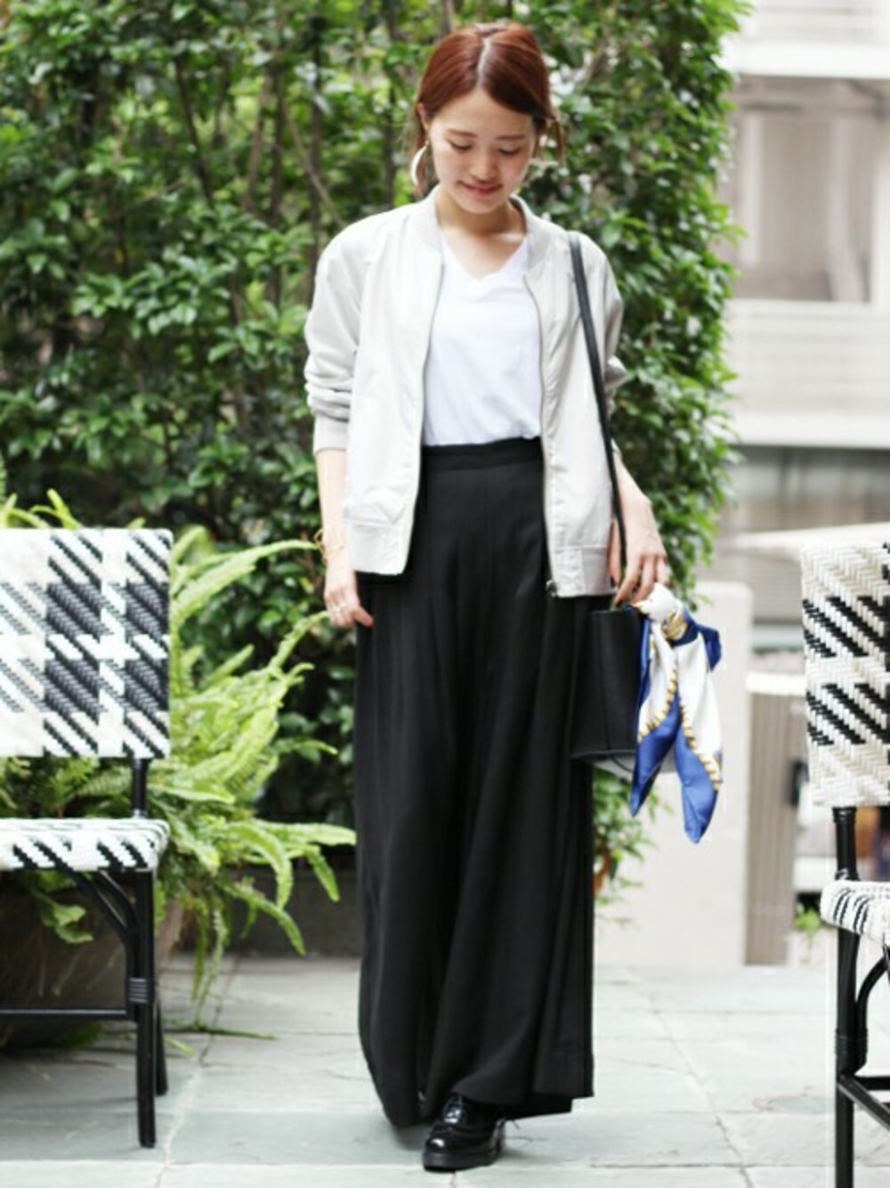 秋のモノトーンスタイル 毎シーズン大人気のMA-1ブルゾンに、トレンドカラーのグレーが登場! ボリューム感のあるワイドパンツとのバランスも◎