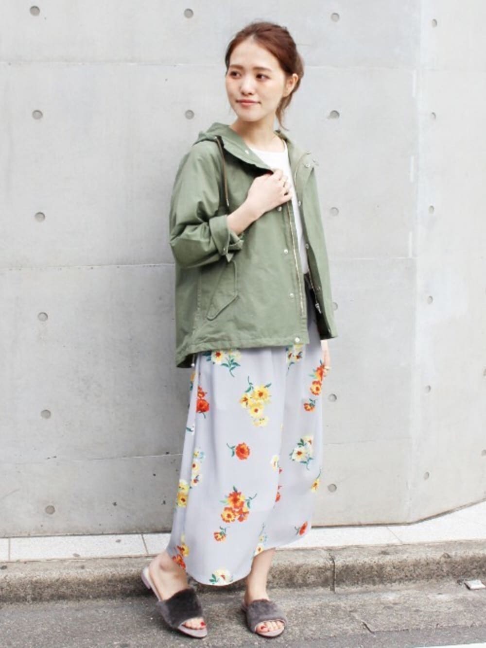フードコート×フラワースカート relume大人気のフラワープリントスカートにフードコートを合わせたコーディネート!フードコートを合わせると甘すぎないヘルシーな印象に。