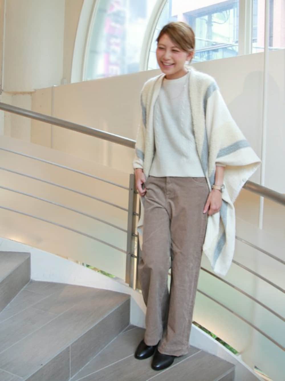 ペールトーンでまとめた女性らしい秋のコーディネート。 温かみのあるケーブル編みやコーデュロイアイテムも、淡いトーンでまとめて女性らしい柔らかな雰囲気に♪ 足元は、ブラックのサイドゴアにすることでぐっと引き締まりオトナっぽく仕上がります。