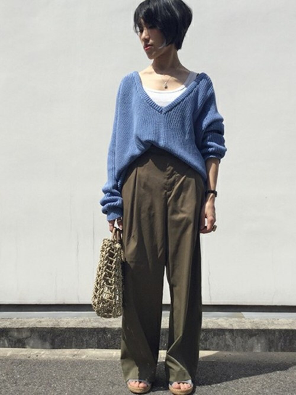 ブルー×カーキ スタイル 鮮やかな色味が新鮮なコットンのニットは注目のBASERANGEより入荷! 定番のアルトリティモのワイドパンツと合わせて機能性も兼ねたスタイリングです♪