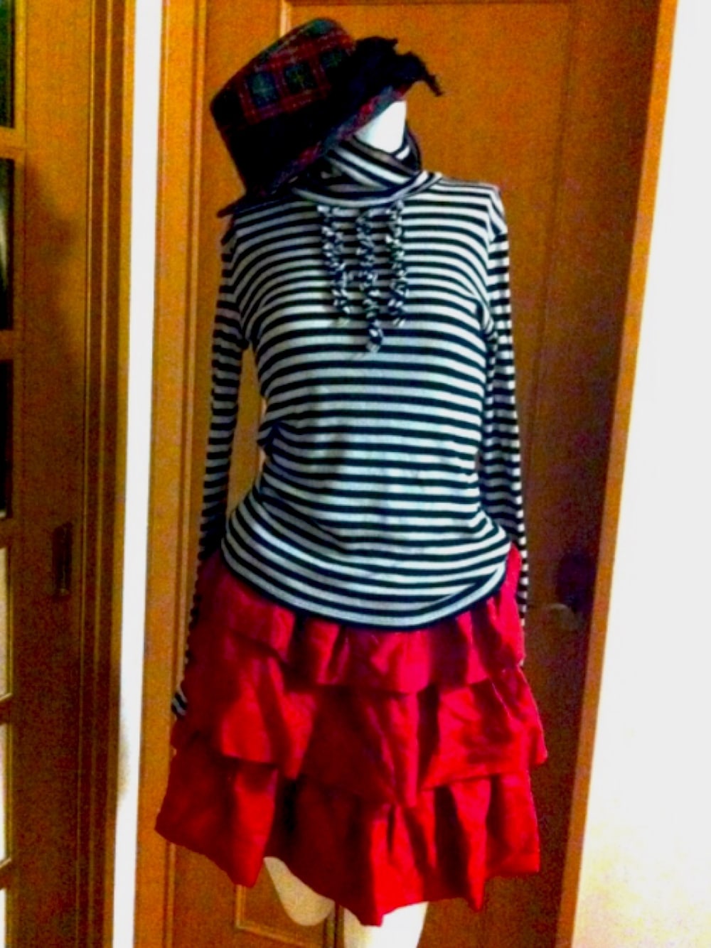 クリスマス近くなると 赤着たくなるよねぇ。 とりあえずおうちのトルソーも お着替え。 このまま着るかは考えちゅ。