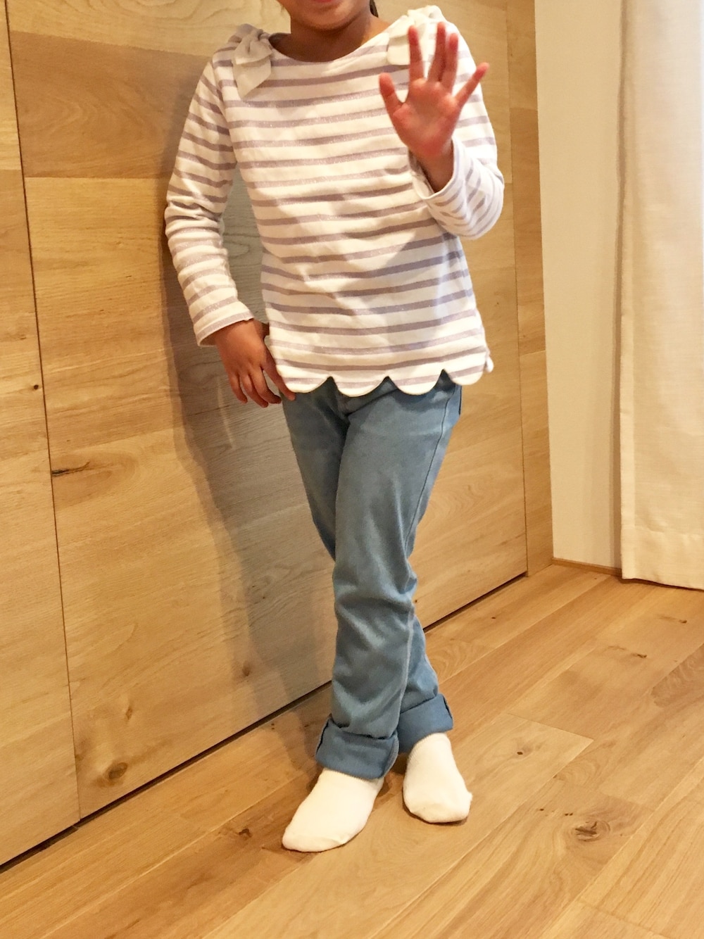 プティマインのボーダーのトップスはキラキラした素材で娘のお気に入り❤︎ 肩の大きなリボンも裾のスカラップのデザインも可愛い!! ユニクロのパンツはよく伸びるので履きやすいです★
