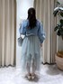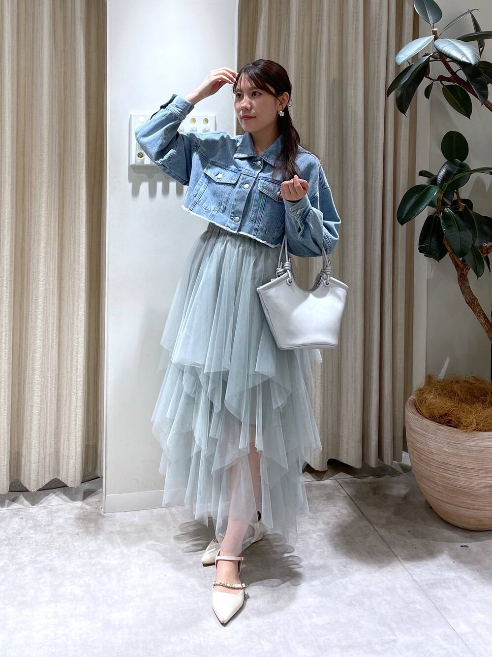 【outer】 切りっぱなしデザインの短丈デニムジャケット 春といえばデニム!ジャケット!!! デニム素材の割にはかなり柔らかい素材なので 動きにくさはありません!! そして短丈でウエスト位置が上の方にあるので スタイルアップで着れちゃいます🫶🏻💓 同素材のワンピースと合わせると セットアップでも着れます🎀 skirt】 mystywomanで大人気の チュールスカート🌷 裏地が短く切ってあるので ブーツ合わせが相性抜群です✨ ランダムチュールなので思わず回りたくなっちゃう💓