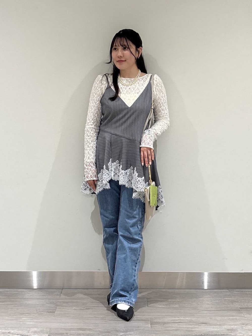 【トップス】 リバーシブルで色と前後2wayで首元のデザインを変えて、お召しいただけるレーストップスです🤍 ジャケットやトレンチコート、キャミワンピのインナーとしても着回せます◎ 【レースキャミ】 今年トレンドのレースキャミ! フレアデザインで腰回りをカバーできます! トップスのレイヤードコーデや、ジャケットのインナーとしても大活躍インナートップス! 身幅が広めなのでトップスの上からキャミを重ねても◎ 肩紐はアジャスターで長さ調節可能です! 【デニム】 S.M展開デニムパンツ 去年大人気だった【KUROKIデニム】からセミワイドデニムパンツが登場しました✨ 裾に向かって少し広がるデザインで足元を綺麗に見せてくれます! 骨格ストレートにはおすすめのデニムパンツです!