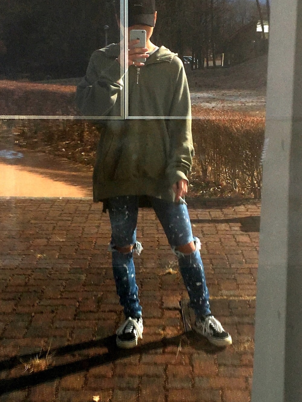ブラック系のスニーカー、グリーン系のパーカーを着用したメンズの冬コーディネートの1枚目の写真