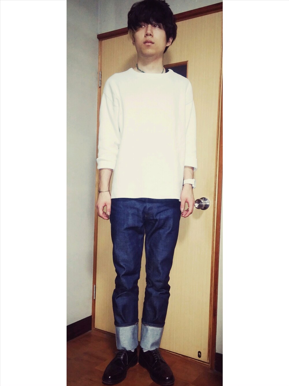 リラックススタイル。 カジュアルになりすぎないように革靴でシュと。