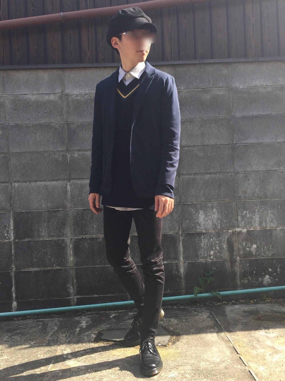 ジャケットとベスト、スキニーのシンプルIラインコーデ。 エリは出した方がかっこいい気がする。